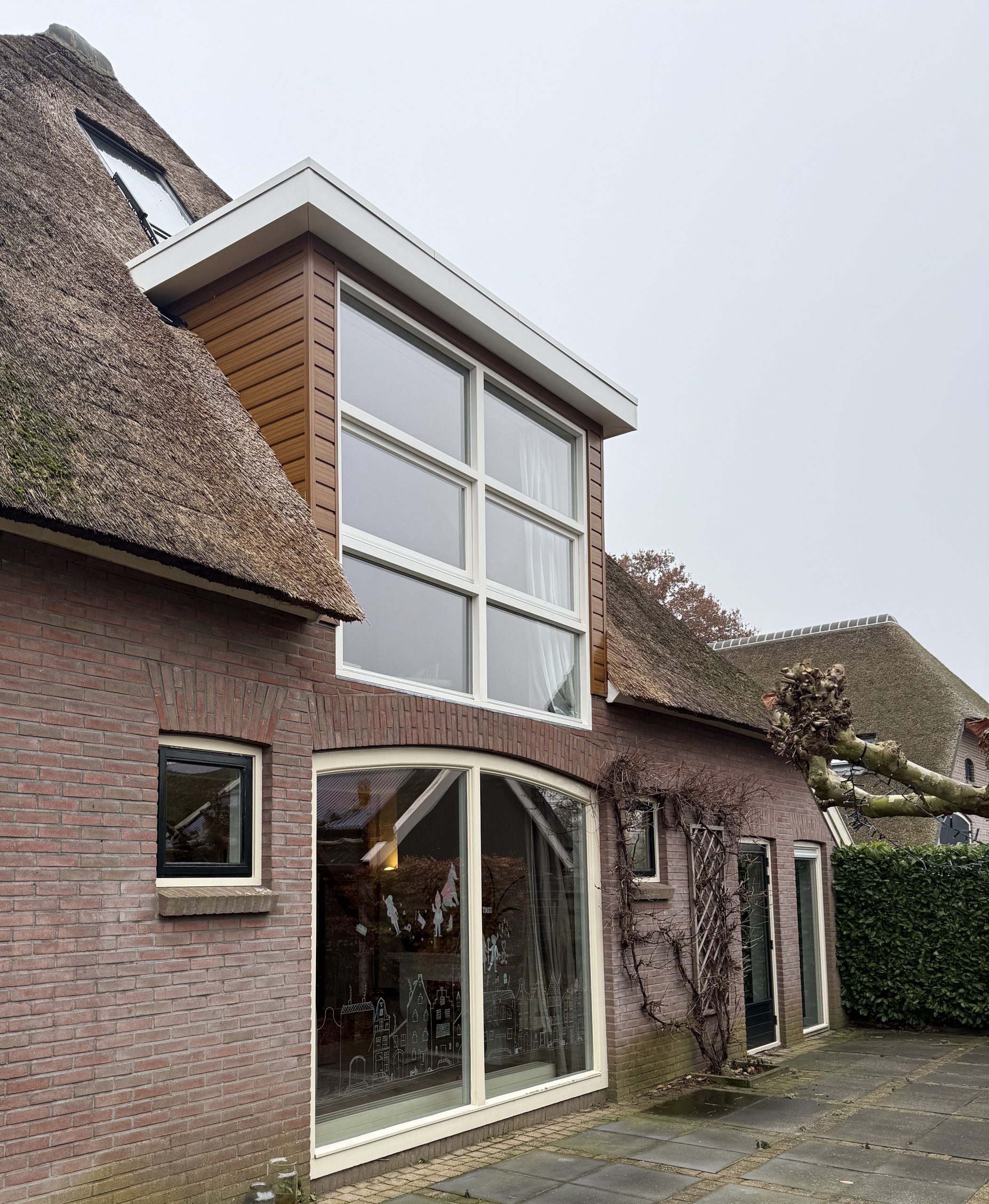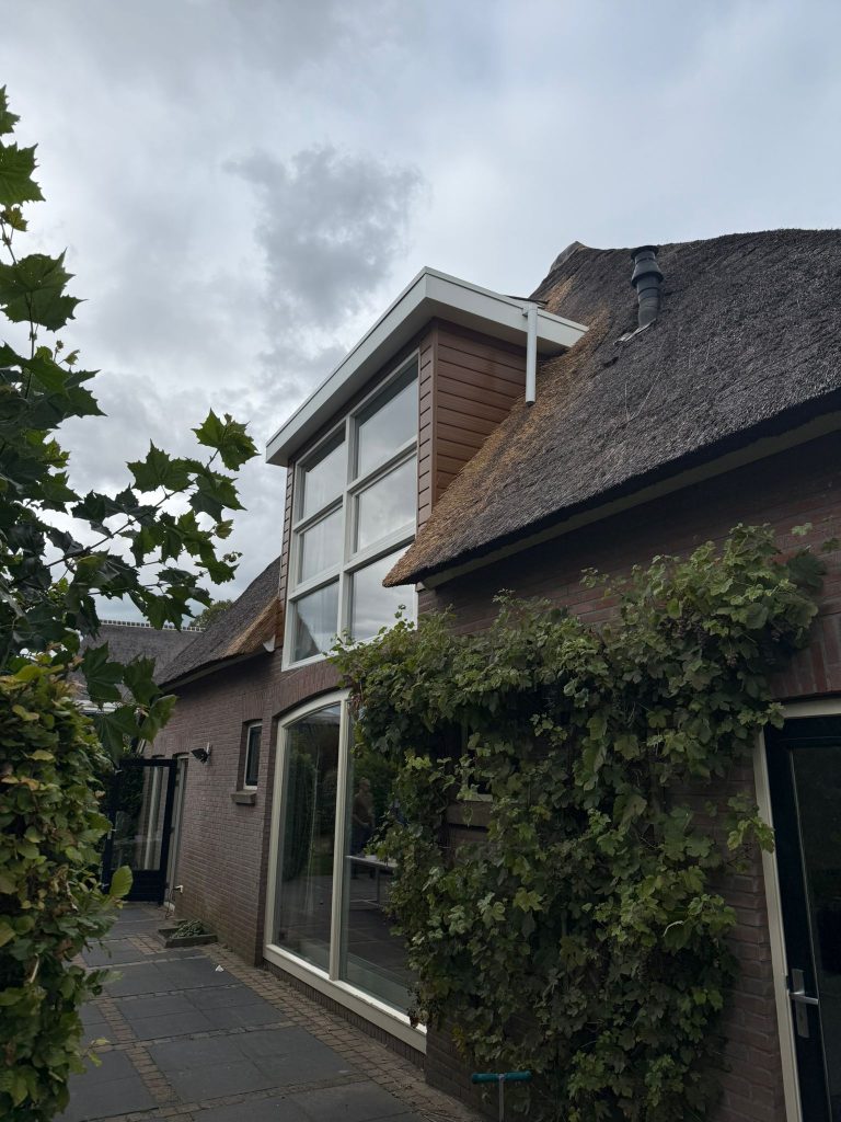 Aan de achterzijde van de woning hebben we een dakkapel geplaatst bij de slaapkamer. Dit zorgt niet alleen voor extra ruimte en licht, maar biedt ook een prachtig uitzicht over de omliggende landerijen.